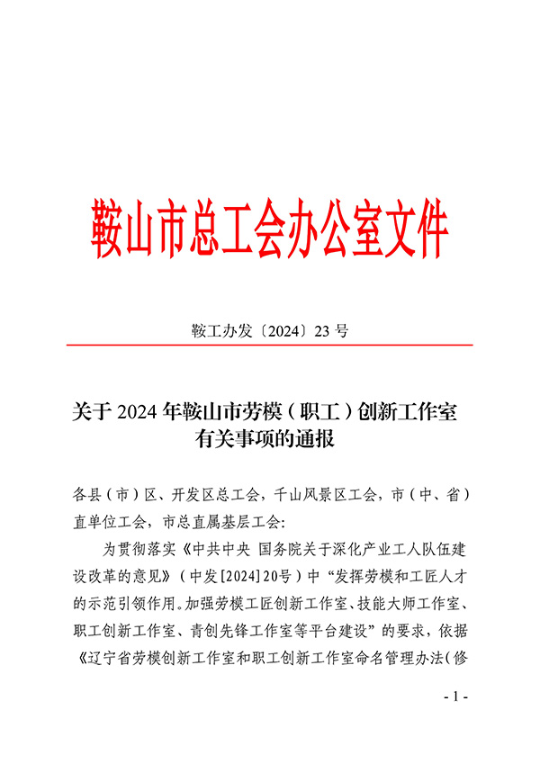 喜訊:白宏偉職工創新工作室被評為鞍山市職工創新工作室